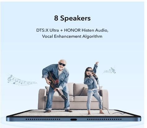 Powerful 8 Speakers Sound System Offering an unrivaled audio experience, the all- HONOR Pad 8 features eight speakers placed symmetrically on both sides, bringing users stronger and more balanced sound effects. With Hi-Res Audio certification, users can enjoy superior and original sound reproduction
