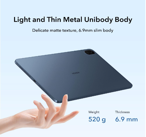 Metal Unibody Design Featuring a premium design with a lightweight aluminum alloy body, the HONOR Pad 8 weighs just 520g and boasts a thickness of 6.9mm, allowing users to hold the tablet with one hand comfortably. With curved edges and an exquisite, frosted finish, HONOR tablet delivers a smooth touch and a premium look and feel