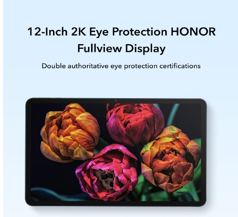 12-inch 2K Eye Protection Display The HONOR Pad 8 boasts a 12-inch large eye-care FullView display, offering an industry-leading screen-to-body ratio of 87 percent and a truly immersive viewing experience for work and entertainment. It also supports a resolution of 2000x1200 pixels and 1 billion colors, delivering stunning clarity and true-to-life hues